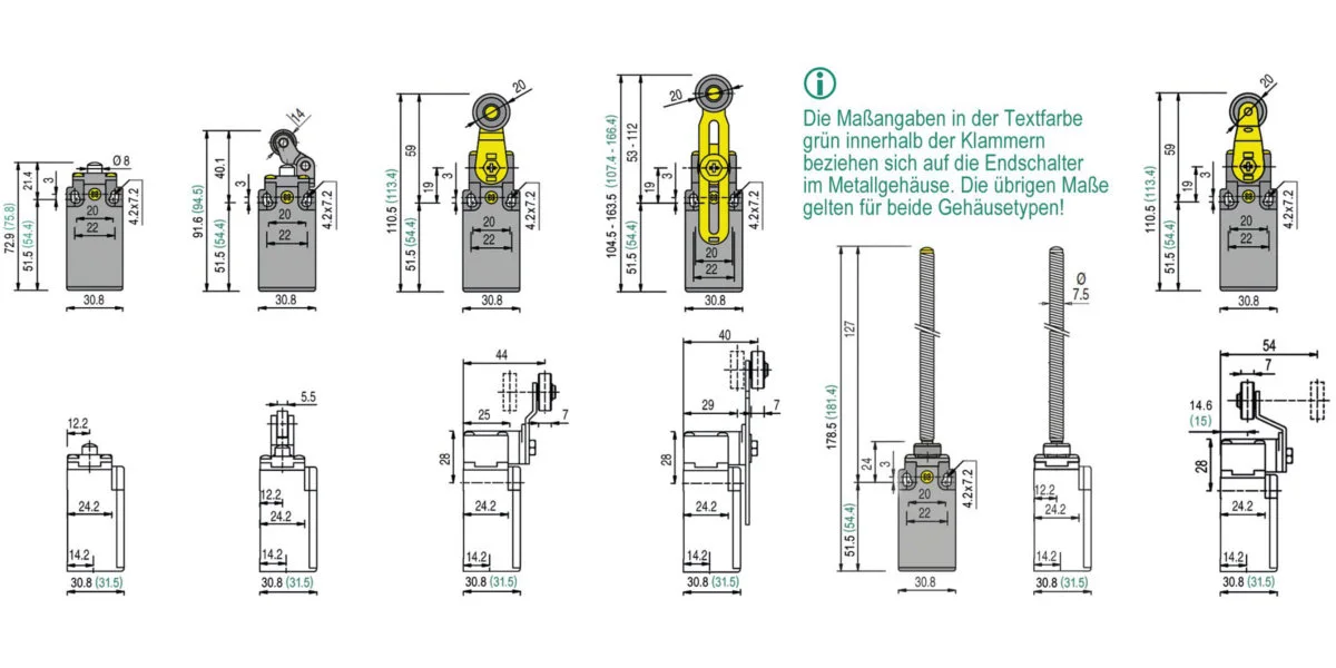 Endschalter mit Stößel AP, Sprungkontakt, 1 Schließer+1 Öffner, IP 67, mit Kabelverschraubung M 20