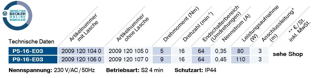 Becker - Rollladensantriebe P5-E03 bis P9-E03, Serie P, Typ E03 mit elektronischer Endabschaltung