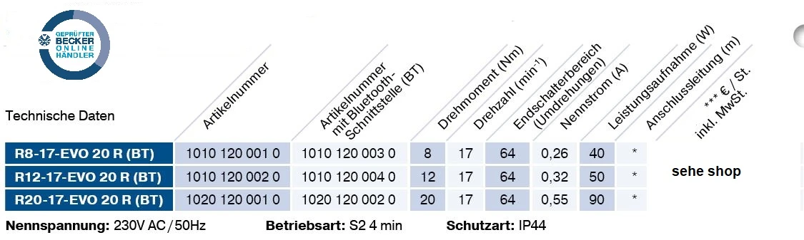 Becker - Rollladenantriebe R8-EVO 20 R (BT) bis R20-EVO 20 R (BT) der Evolution-Serie