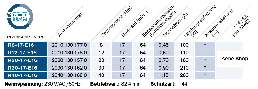 Becker - Sonnenschutzantriebe R8-E16 bis R40-E16 Serie R-E16 für Verriegelungssysteme