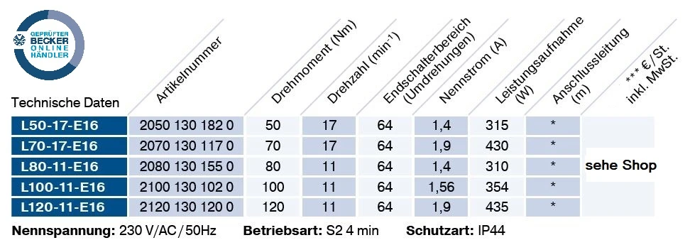 Becker - Sonnenschutzantriebe L50-E16 bis L120-E16, Serie L-E16 für Verriegelungssysteme