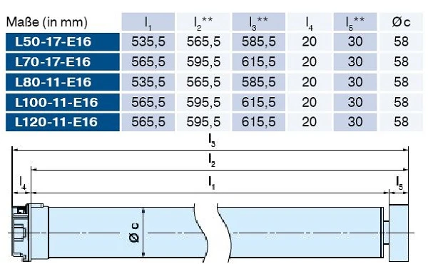 ** Mitnehmerbreite von DW78N (4931 300 365 0) , bei Wahl eines anderen Mitnehmers ändern sich die Maße l2, l3 und l5