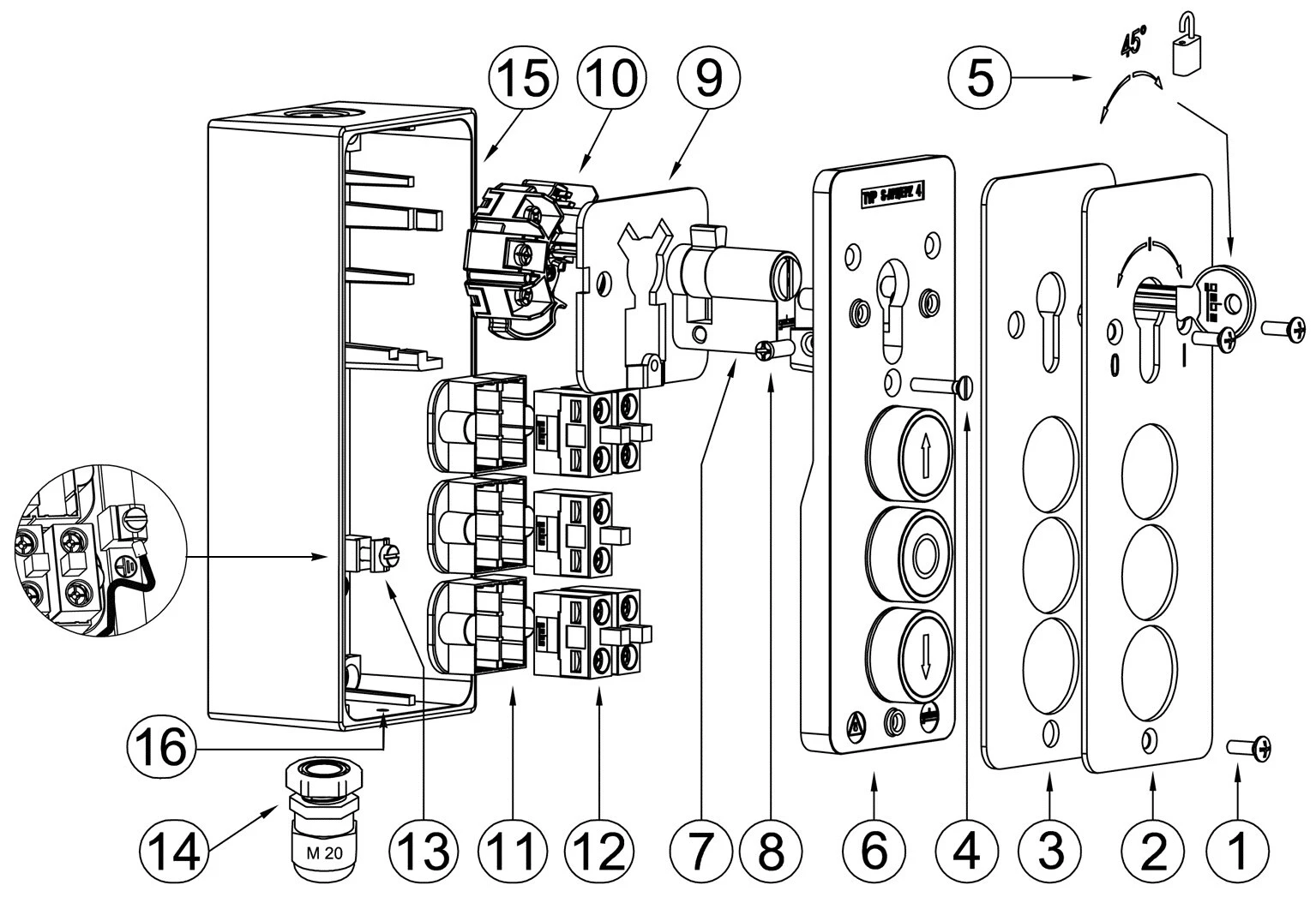 WTS - Standard - Schlüsselschalter mit 1 Rast-Kontakt Schlüssel : Ein/Aus Drucktasten: AUF/STOP/AB, AP Wassergeschützt - Schutzart IP 54