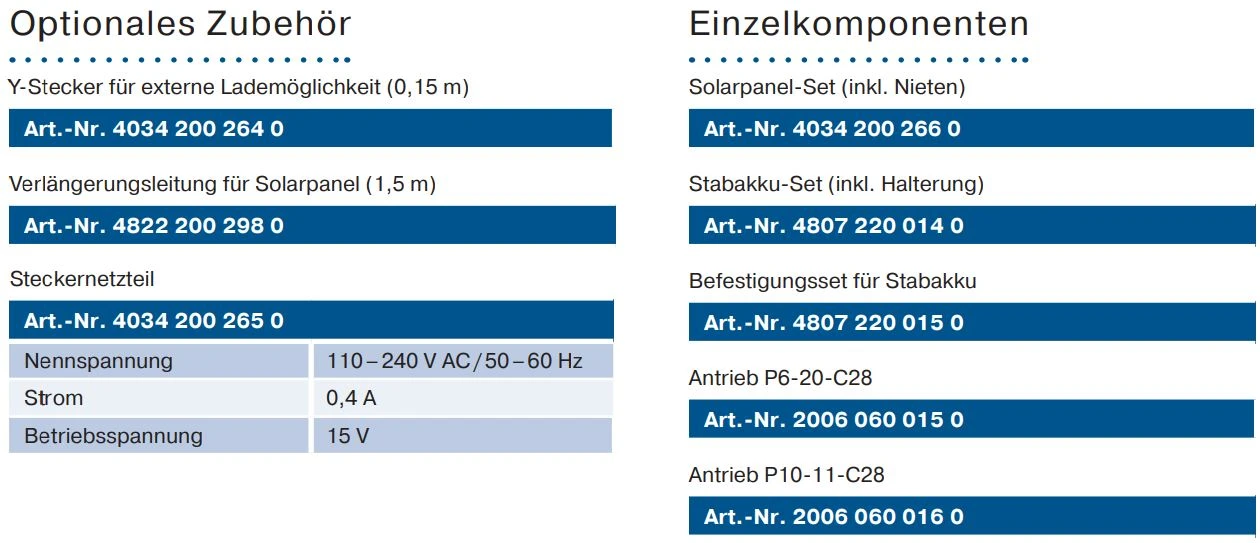 • Lieferumfang: DC-Antrieb, Solarpanel und Akku mit Halterungen, Mini-Lasche-P (4930 200 232 0), Wandlager-P/R mit Raste (4930 300 382 0), Mitnehmer / Ring S40 (4930 300 083 0 / 4930 300 085 0) und Mitnehmersicherung (4930 300 161 0)