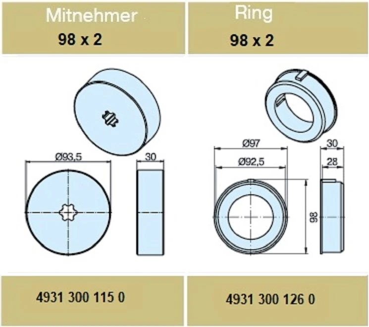 Bestehend aus Mitnehmer und Ring aus Guss / Kunststoff .